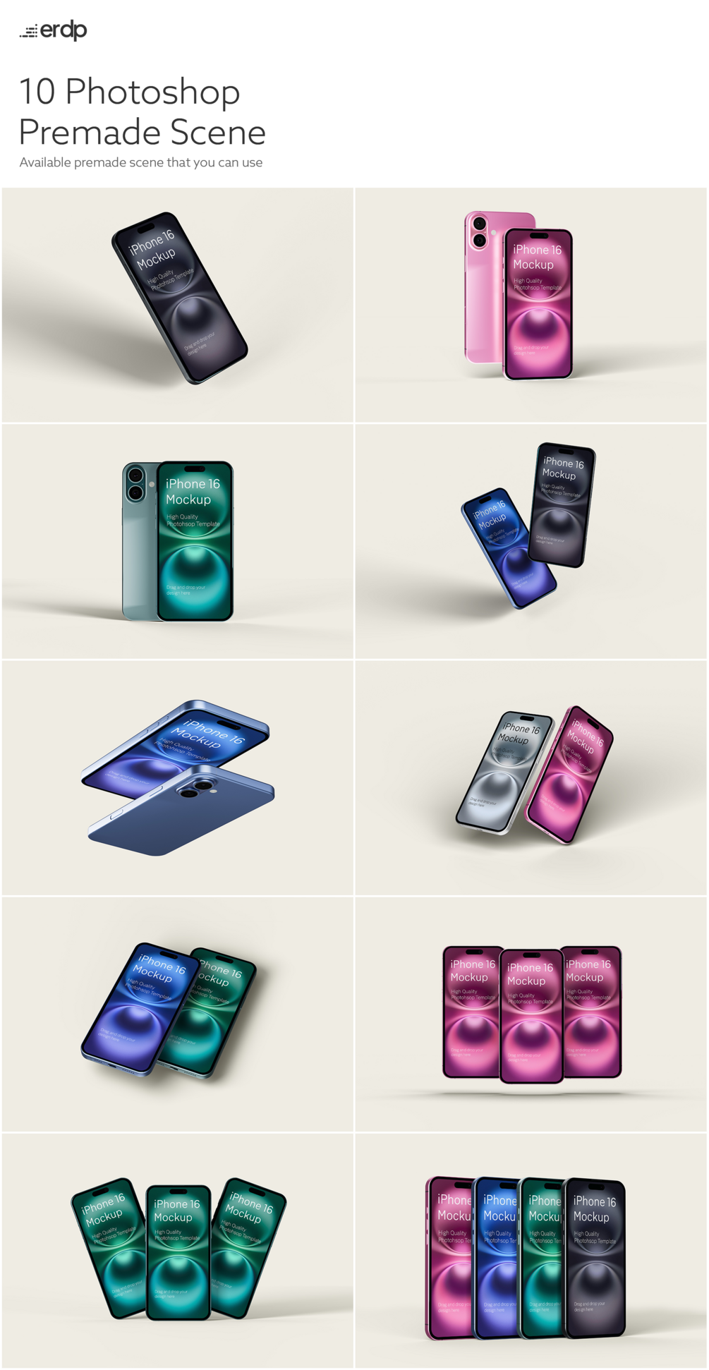Elevate your design presentations with the iPhone 16 Screen Mockup – a premium set of 10 dynamic, high-quality scenes crafted to captivate and impress. Perfect for showcasing apps, websites, and digital content, each mockup highlights the stunning clarity and sleek design of the iPhone 16. With easy-to-edit smart layers, you can customize each scene in seconds, creating professional, polished visuals that make your work stand out and drive sales.