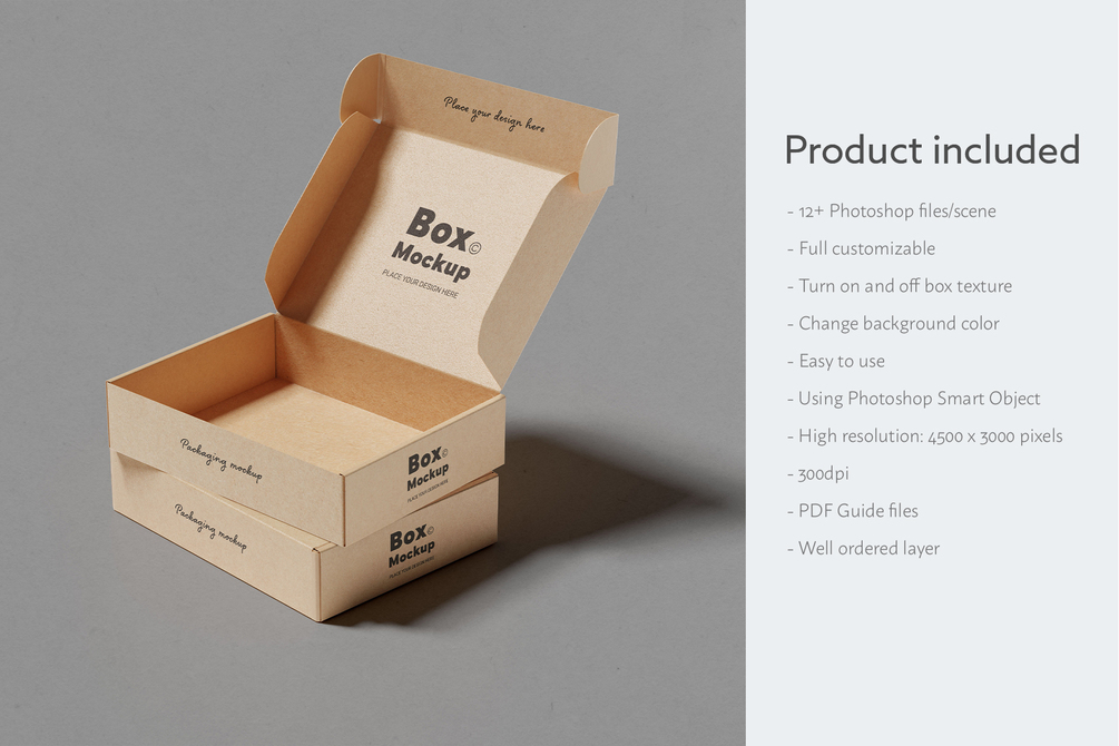 If you want to showcase your box design and look good, use this box packaging mockup to make your box design look good. This box packaging mockup is easy to use. It uses Photoshop Smart Object, drag and drop your excellent design into Photoshop Smart Object, and your showcase is ready. Don't worry if you are a beginner in photoshop, PDF instruction included.