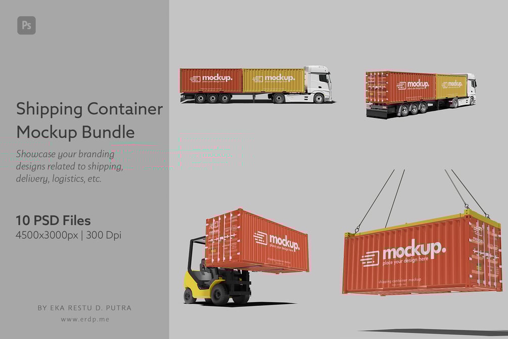 Elevate your brand with our Shipping Container Mockup Bundle! Perfect for logistics, shipping, delivery, shopping, and advertising designs. High-res at 4500x3000px, 300dpi, it's sharp and realistic. Customize with ease – drag and drop. The package includes 11 PSD files and a handy PDF guide.